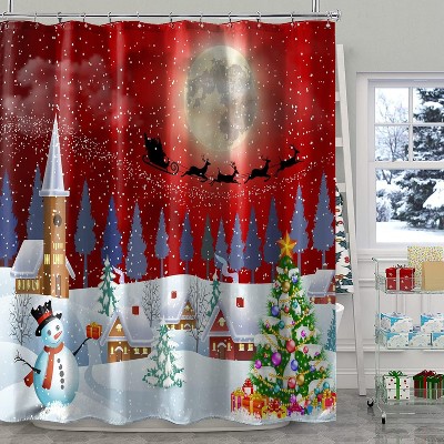 Christmas Red Winter Landscape Santa Claus Snowman Xmas Tree Holiday Theme Fabric Cloth Bathroom Shower Curtain 70.8x70.8 Inch