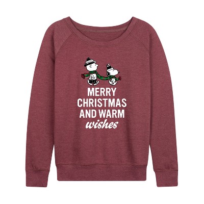 Women's - Peanuts - Merry Xmas Warm Wishes Lightweight French Terry Wide Neck Long Sleeve Graphic Shirt
