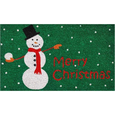 HomeRoots 17" X 29" Green White And Red Christmas Snowman Merry Christmas Outdoor Coir Door Mat