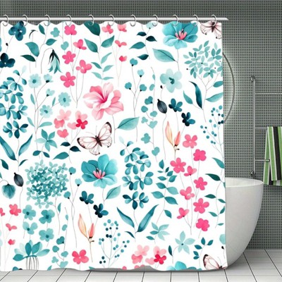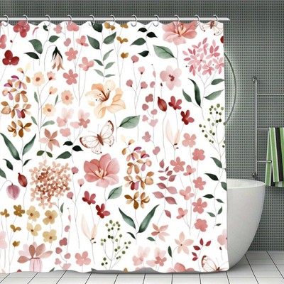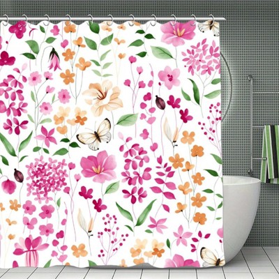 Pink Flower Shower Curtain, Hot Pink Watercolor Floral Shower Curtains, Modern Abstract Ink Decorative Fabric Shower Curtain Set 70.8x70.8 Iniches