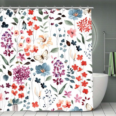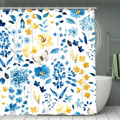 Shower Curtain Set, Blue Watercolor Floral Bath Curtain, Waterproof Fabric Bathroom Curtain 70.8x70.8Inch