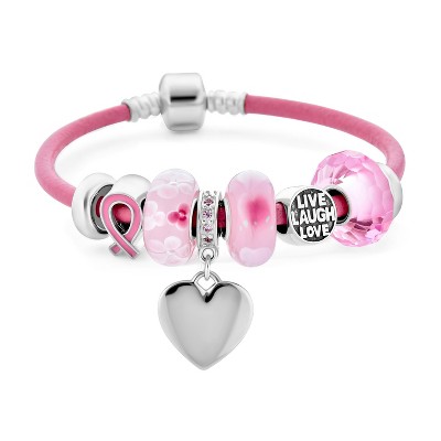 Bling Jewelry Breast Cancer Pink Ribbon Heart Charm Live Laugh Love Bead Charm Leather Bracelet Sterling Silver