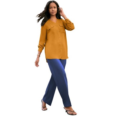Agnes Orinda Women's Plus Size Sheer Notched Neck Roll 3/4 Sleeve High Low Hem Solid Casual Chiffon Blouses with Pocket Decor