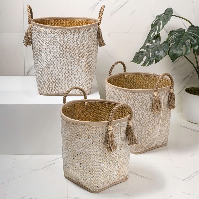 happimess Celia Rustic Coastal Handwoven Palm Leaf Nesting Storage Baskets with Rope Handles
