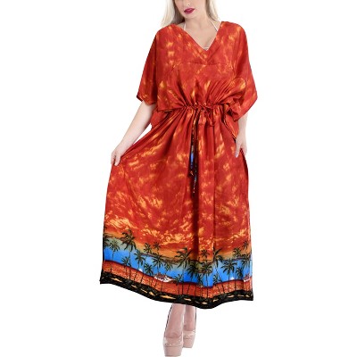 LA LEELA Women's House Daily Routine Evening Wear Loungewear Casual Long Kaftan Cover Up Slit Dress Maxi Dresses Caftans for Women 2X-3X Orange, Tree