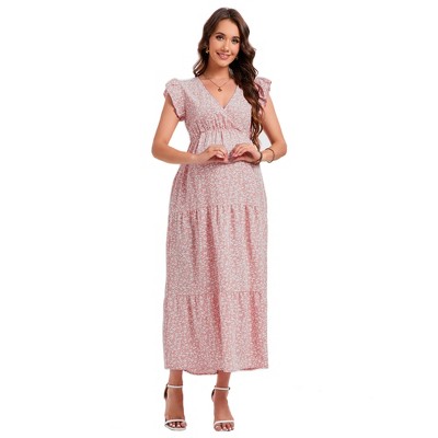 Maternity Square Neck Maxi Dress Short Sleeve Floral Summer Dresses With Side Pockets