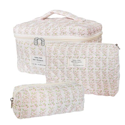 Narwey Cute Cotton Quilted Makeup Bag Set, Large Travel Cosmetic Bag for Women, Big Make Up Bag with Toiletry Organizer