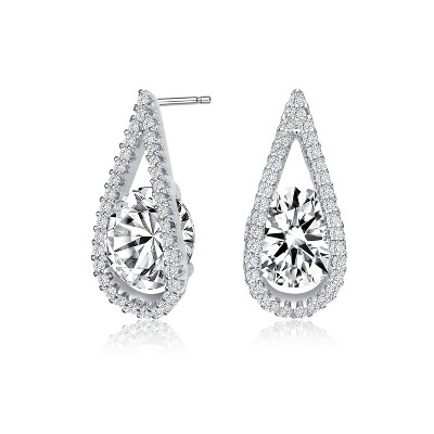 Guili Halo Glow Sterling Silver Rhodium Plated Clear Round Cubic Zirconia Pear Frame Earrings with Radiant Brilliance and Timeless Charm