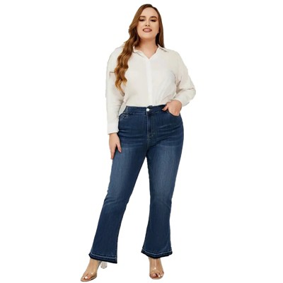 Mid Waist Dark Blue Flare Denim Jeans Pants for Women