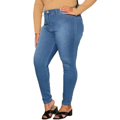 Women's Plus Size Vintage Jeans Washed Denim Blue Mid-Waist Skinny Fit Full-Length Pants Ladies Trousers