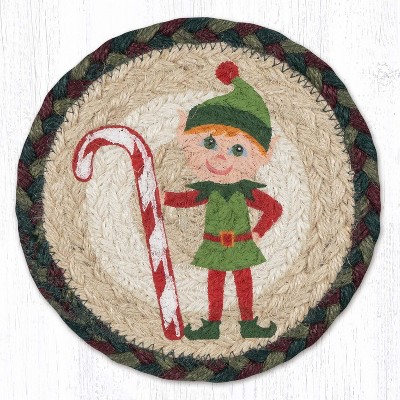 Elf Candy Cane Large Coaster – 7" x 7" Round Braided Jute Hand-Stenciled Coaster By Earth Rugs