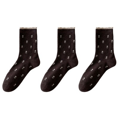 Anna-Kaci Women's 3-Pair Minimalist Crew Socks with Embroidered Bow Detail Soft Knit Everyday Comfort Sock Set - Coffee