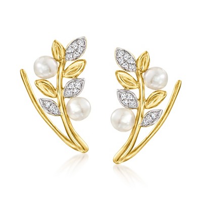 Ross-Simons 3.5-4mm Cultured Pearl Leaf Ear Climbers With Diamonds in 14kt Yellow Gold