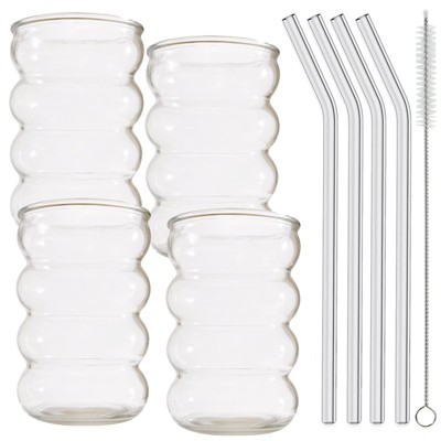 Itopfox 4 Pcs Drinking Glasses with Glass Straw, Cocktail & Iced Coffee Glasses Set, Ideal for Water, Soda, Tea, Gift - Includes Cleaning Brush