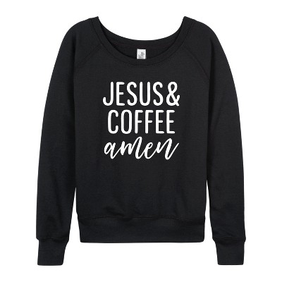 Women's - Instant Message - Jesus And Coffee Amen Lightweight French Terry Wide Neck Long Sleeve Graphic Shirt