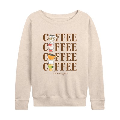 Women's Gilmore Girls Coffee, Coffee, Coffee Lightweight French Terry Wide Neck Long Sleeve Graphic Shirt - Birch - 1X