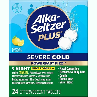 Alka-Seltzer Plus Severe Cold Night Effervescent Tablets Lemon, Nighttime Relief for Cough, Congestion, Fever & Aches, 24 Count