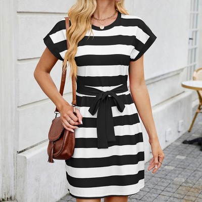 Women's Summer Stripe Color Block Dress, Crew Neck Loose Short Sleeve Waist Tie, Casual Versatile Daily Midi Dress