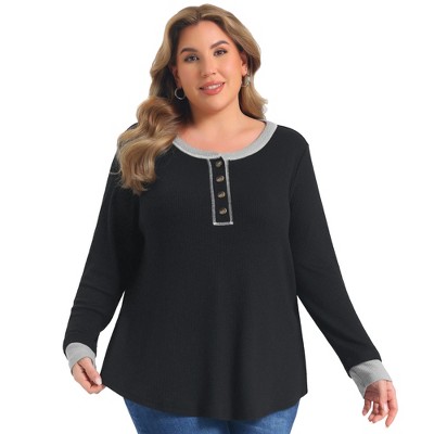 GRACE & GRANDEUR Women's Plus Size Front Button Contrast Color Crew Neck Long Sleeve Casual Blouses