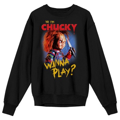Chucky Hi I'm Chucky Wanna Play Adult Black Crew Neck Long Sleeve Fleece Sweatshirt