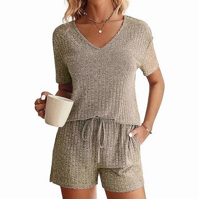 Ekouaer Pajama Set for Women Waffle Knit Lounge Sets Long Sleeve Top and Shorts Sleepwear Matching Loungewear