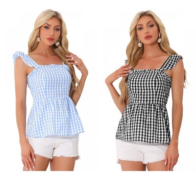Women's Plus Size Gingham 1950s Vintage Back Button Crew Neck Ruffle Sleeve Hem Casual Plaid Blouses - Agnes Orinda