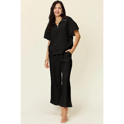 I am a Fashion Junky Double Take Full Size Texture Half Zip Short Sleeve Top and Pants Set