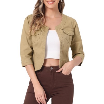INSPIRE CHIC Women's Casual 3/4 Sleeve Collarless Button Up Cropped Denim Jacket