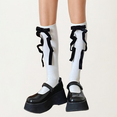 Anna-Kaci Women's Knee High Bow Ribbon Socks with Ruffle Trim, Soft Stretch Tall Dress Socks for Statement Styling - One Size Fits Most, White