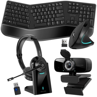 Delton Work Anywhere 90X Wireless Noise Canceling Bluetooth Computer Headset Kit with 1080p Webcam, Ergonomic Wireless Keyboard & Mouse, Black