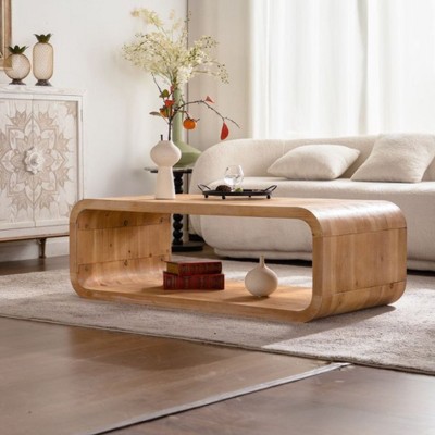 JVNOXK Modern Curved Light Wood Coffee Table with Open Storage, Racetrack Open-Frame Accent Table for Contemporary Living Room