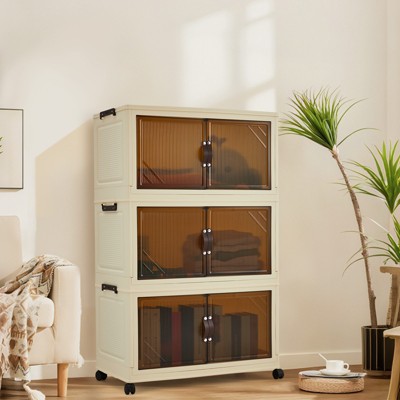 VECELO 1/2/3 Tier Stackable Storage Bins with Lid, Foldable PP Storage Cabinet Home Organizer with Lockable Wheels, White