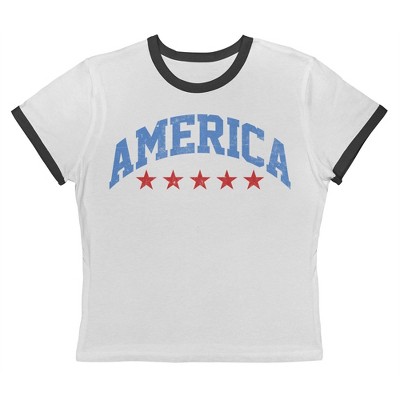 Rerun Island Women's America Eagle Flag Americana 4Th Of July Short Sleeve Graphic Cotton Retro Vintage Ranger Baby Tee - Caviar White S