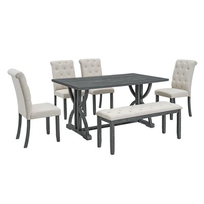 6 Piece Retro Dining Table Set Dining Set Kitchen Table Set with 4 Upholstered Chairs and 1 Bench, Gray Wash/Natural Wood Wash-HABITRIO