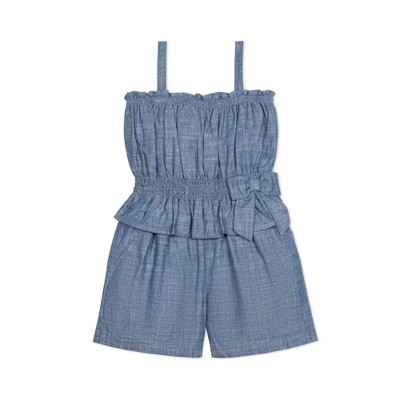 Hope & Henry Girls' Organic Sleeveless Smocked Waist Chambray Romper, Blue Chambray, 2T