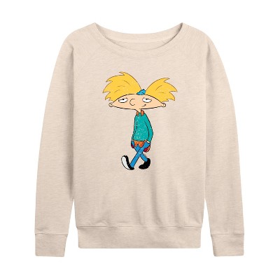 Women's - Hey Arnold! - Distressed Arnold Lightweight French Terry Wide Neck Long Sleeve Graphic Shirt
