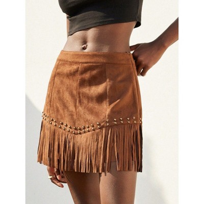 Coolmee Women's Suede Skirts Fringe Sexy Country Concert Outfit Western High Waisted Short Skirt with Side Zipper