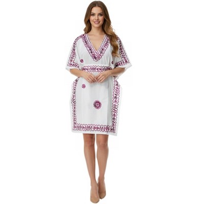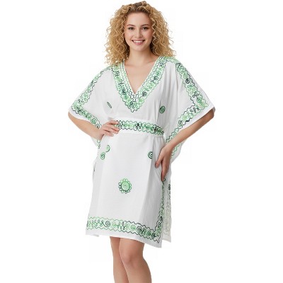 Charmo Women's Lace Embroidery V-Neck Cover Up with Half Sleeves & Flowy Hem Mini Dress