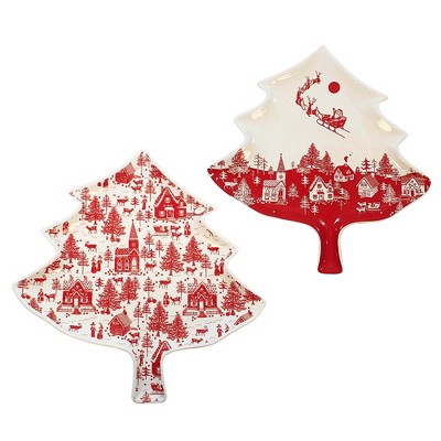 Transpac 14.0 Inch Tree-Shaped Toile Plates Christmas , Santa Sleigh Reindeer Village (2PC)