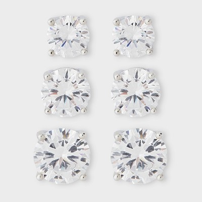 Silver Plated Cubic Zirconia Round Stud Post Earring Set 3pc - A New Day™