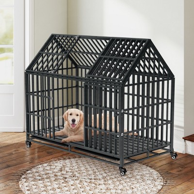 27.2 Inch Dog Crate Furniture with Wheels & Double Door - Wooden and Metal Kennel with Removable Tray for Indoor Outdoor Use