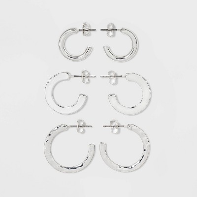 Hammered Metal Hoop Trio Earring Set 3pc - A New Day™ Silver: Nickel-Free Post, Women's Accessories, 0.98" Diameter