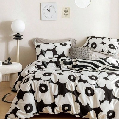 Floral Duvet Cover Queen 100 Cotton Black White Flower 3pcs Set with Zipper Ties Cute Botanical Patterned Bedding