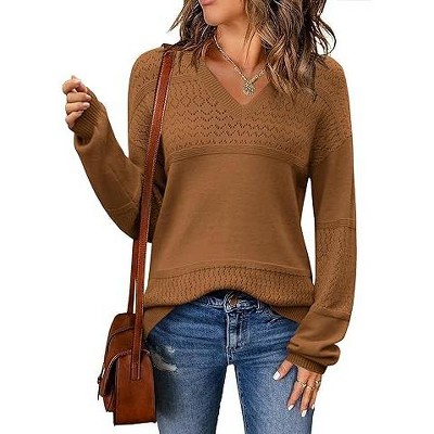 BLUEMING Womens Pullover Sweaters Casual Long Sleeve Ribbed Knit V Neck Lightweight Crochet Pullover Clothes