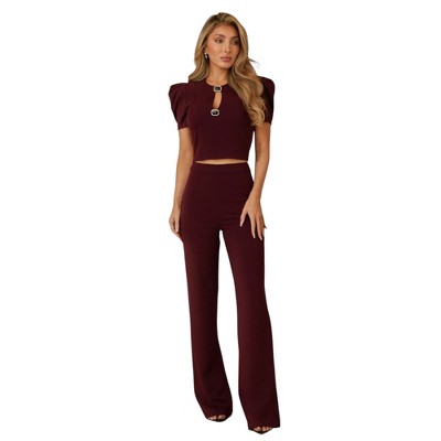 Slickblue Women's Cropped Puff Sleeve Top & Flare Pants Set, Jewel Detail, Night Out Two-Piece, Wine/Red/Black, S-L