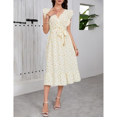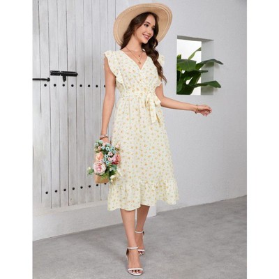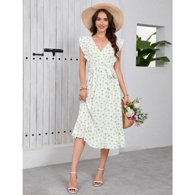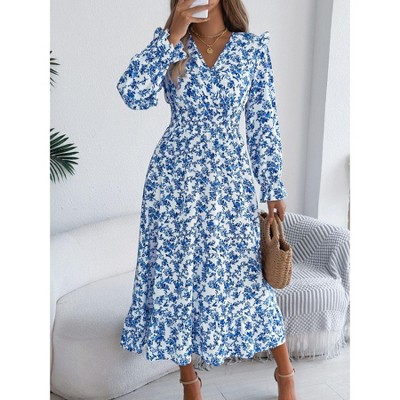 Coolmee Women Boho Floral Waist Smocked Cross V Neck Ruffled Long Sleeve Casual A-Line Midi Dress