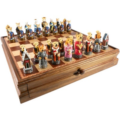 WorldWise Imports Chess Set - Cats & Dogs Resin Chessmen on Walnut Maple Chest