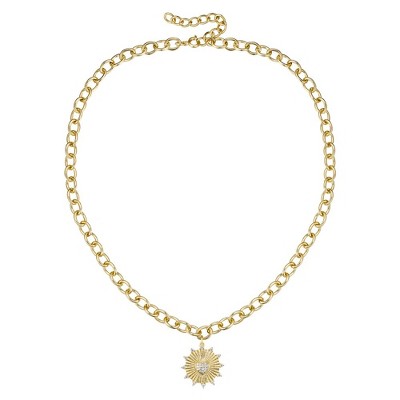 14K Gold Plated Necklace with Vintage Shield Sunshine Pendant, Cubic Zirconia Accents on a Curb Chain with Adjustable Length for a Classy look.