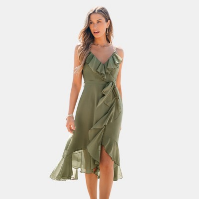 Women's Ruffled Olive Green Chiffon Midi Wedding Guest Dress - Cupshe