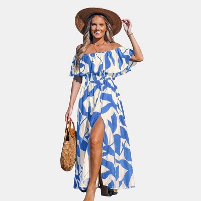 Women's Off-Shoulder Ruffle Smoked Waist Floral Printed Maxi Dress - Cupshe
